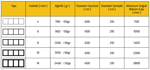 - Kalınlık: 4 mm, 6 mm, 8 mm, 10 mm, 16 mm